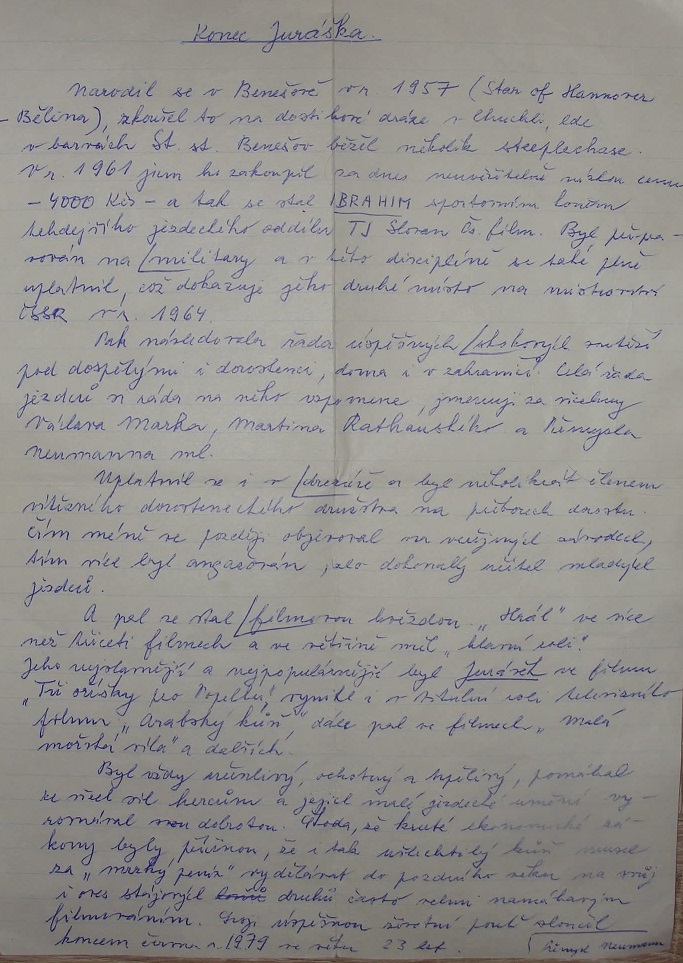 Filmkommandos. Zum Beispiel „hinken“ oder „tot stellen“. Mitglieder des Filmteams erinnern sich daran, wie er beispielsweise graste und beim Ruf „Kamera!“ den Kopf hob und die Ohren spitzte. Er soll sehr geduldig mit Anfängern und insbesondere mit Kindern gewesen sein. Während seiner Zeit im Tschechoslowakischen Filmreitclub weckte er sicherlich bei Dutzenden von Kindern die Liebe zu Pferden. Ich füge eine Liste der Filme bei, in denen er mitgespielt hat. Aber es gibt wahrscheinlich noch mehr: 1971 Spiele der Liebe 1973 Drei Nüsse für Aschenputtel 1973 Goldlöckchen 1976 Eine Biografie voller Fernsehlieder (TV) 1976 Die kleine Meerjungfrau 1978 Der Katzenprinz |